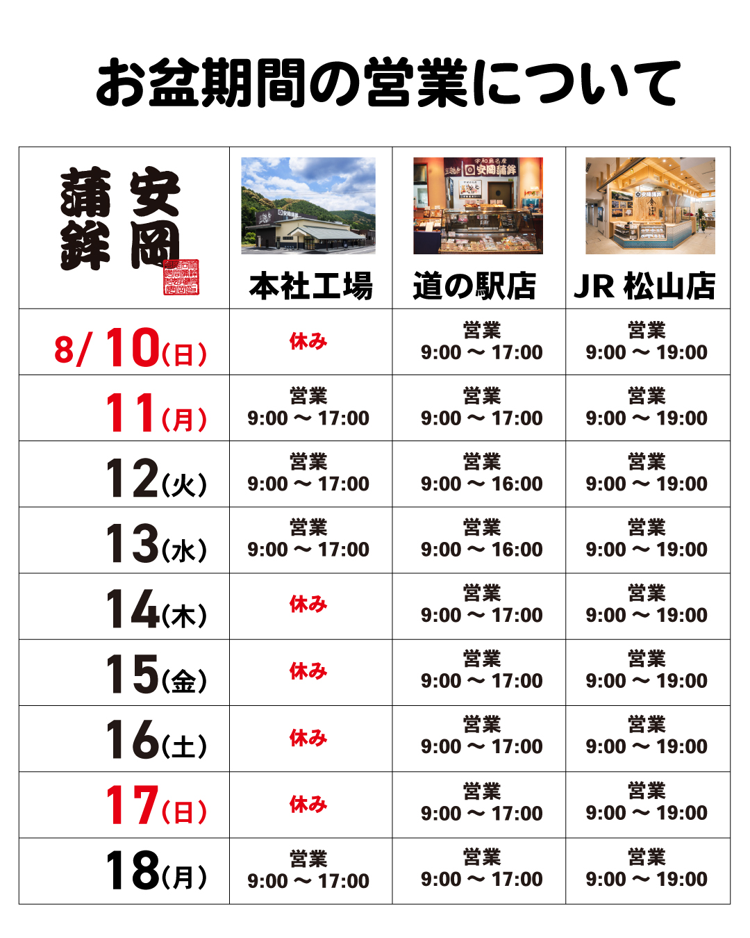 お盆期間中(2025年8月10日〜18日)の各店舗の営業スケジュールを、