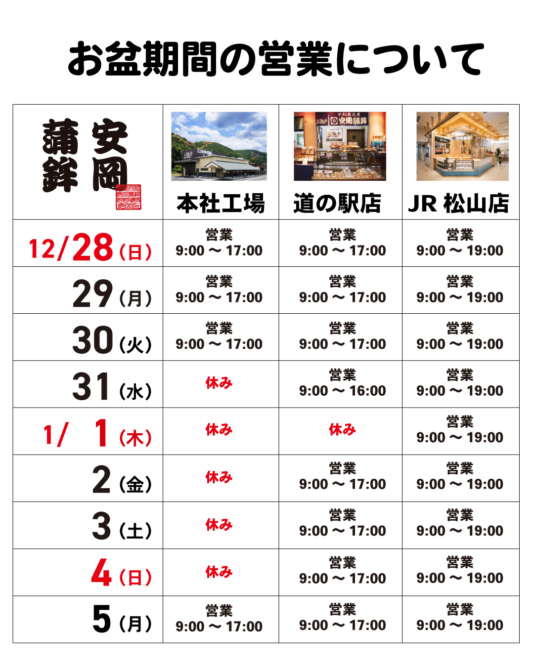 年末年始(2025年12月28日〜1月5日)の各店舗の営業スケジュールを、